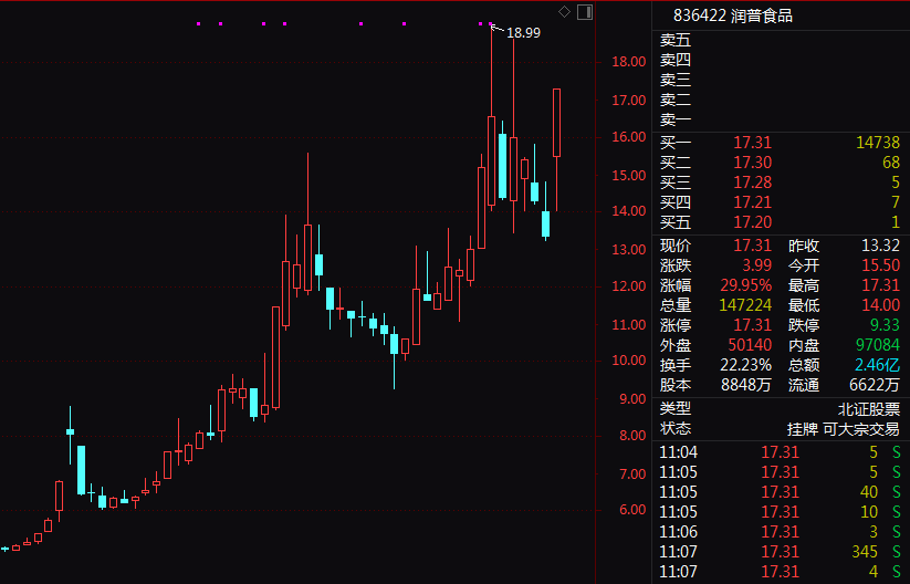 此外,食物饮料成见近来也每每走强,当天早间大幅高开一度涨逾4%,半日成交超昨日全天成交。润普食物仅约6分钟就直线30%涨停,熊猫乳品则20%亦字涨停,一鸣食物更是聚首11日涨停,益客食物、海欣食物等也强势封板。
