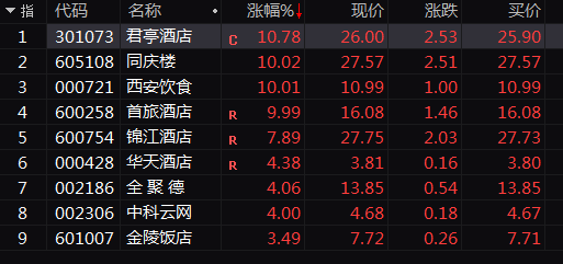 酒店餐饮成见早间大幅高开高走,板块指数盘中放量飙涨近8%,仅半小时成交就与昨日全天成交颠倒。板块内所有个股飘红,同庆楼、西安饮食直线封涨停,君亭酒店、首旅酒店、锦江酒店等涨幅居前。
